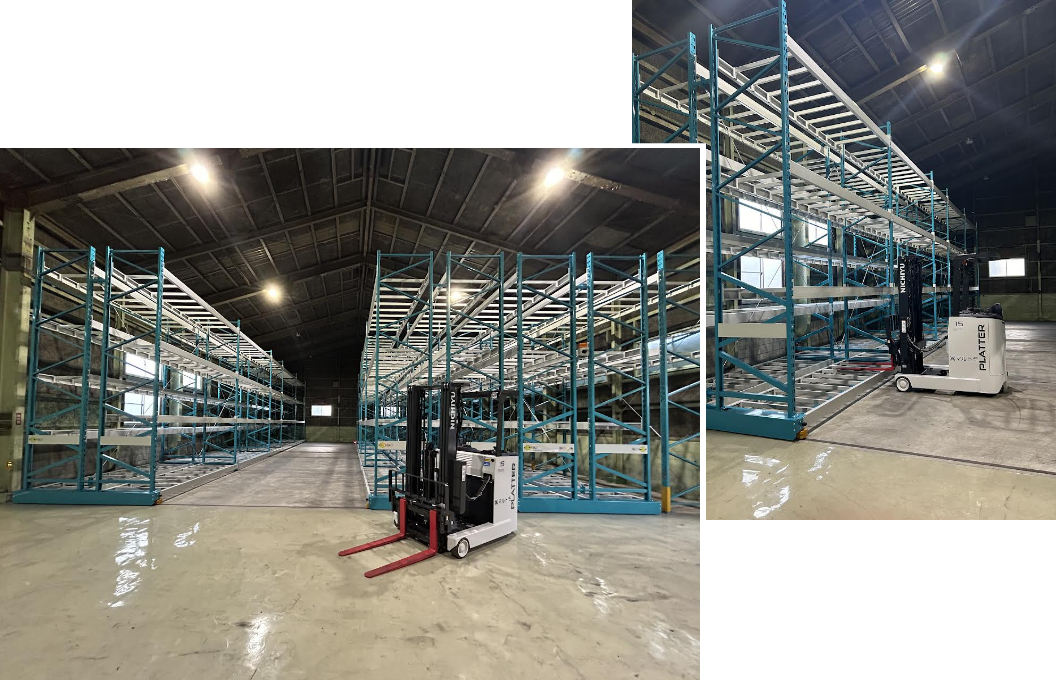 - 木型を保管する自動倉庫です。約200パレット分の収納が可能。本社工場と隣接しており運搬時の時間短縮はもちろん、上部の空間も有効活用できるようになりました。